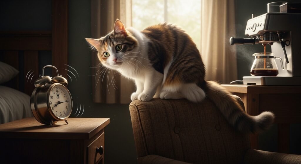 Your cat develops a habit of connecting environmental sounds to your presence whenever the coffee machine starts brewing or the alarm clock rings.