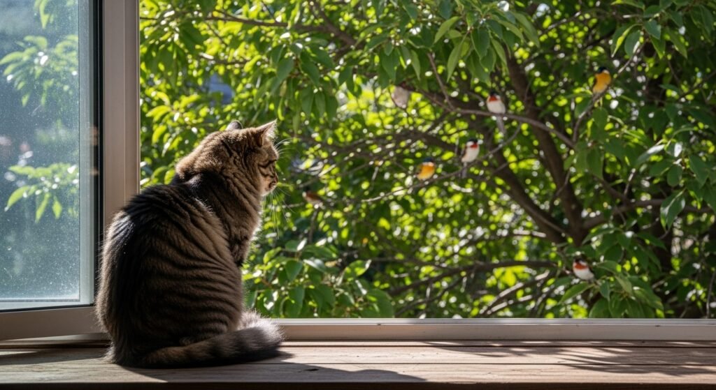 Birds, passing people, and moving leaves give endless entertainment. A clear window view stimulates a cat’s mind, yet numerous windowsills are blocked or inapproachable, limiting this natural enrichment.