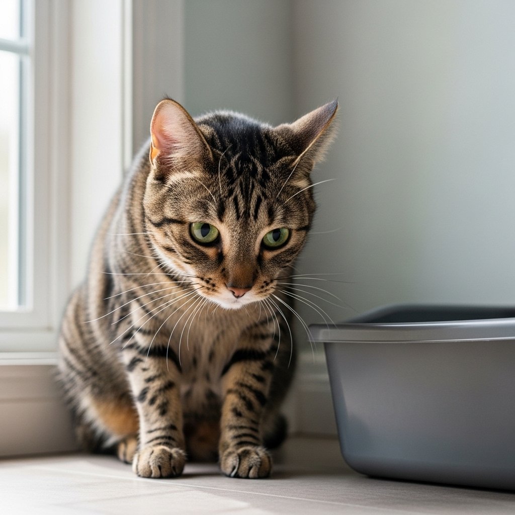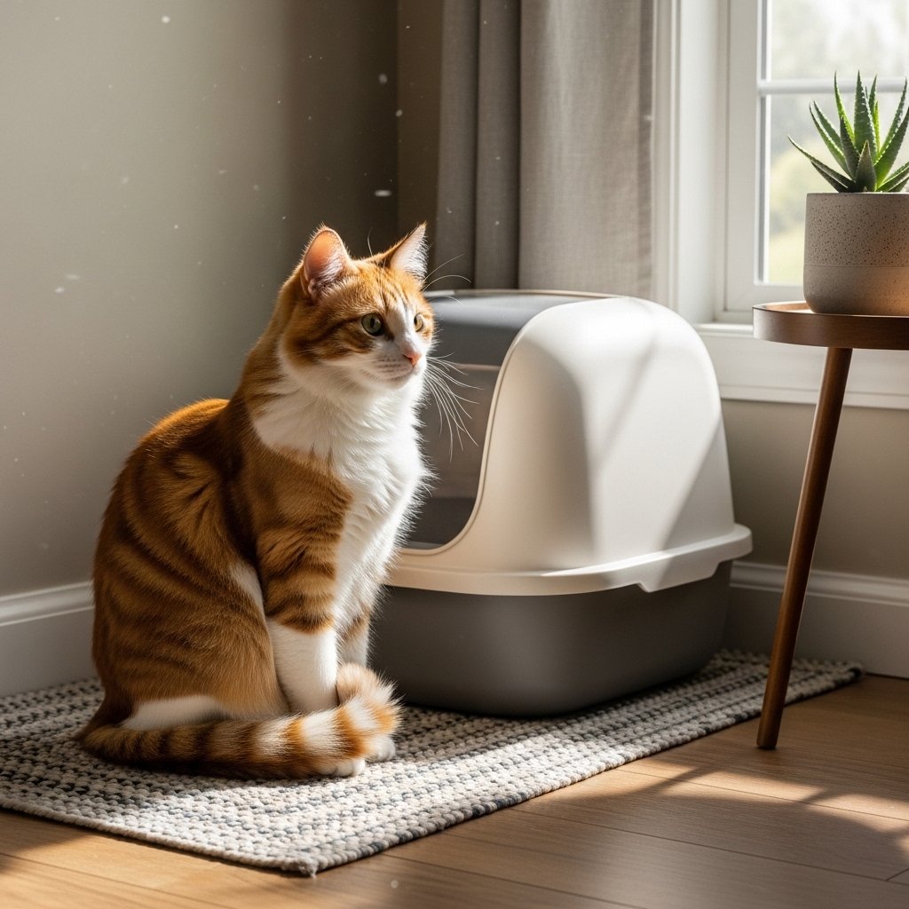 Some cats like to sit nearby while the litter box is cleaned. This behavior allows cats to observe their surroundings while they show interest in monitoring territorial changes.
