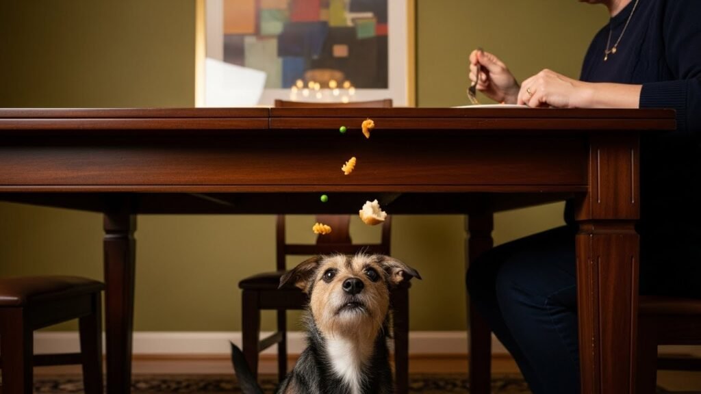 Plate scraps licked clean, bad habit seeds begging eyes. Elevate bowls prevent gulping air, barf less too. Watched a pug choke on fast eats, slow feeder fixed. Dog gear only, floor stays clean people food stays ours.