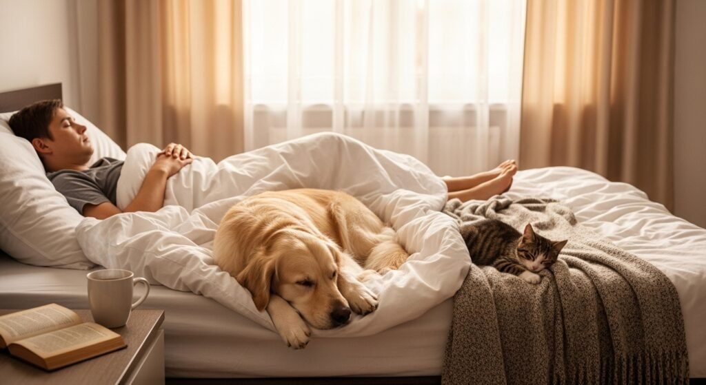 Pets who sleep at your feet create a sleeping arrangement that combines two different sleeping styles. Your pet stays close to you while choosing to keep a distance from you. The situation shows how people feel attached to each other yet believe in themselves to a certain degree.
