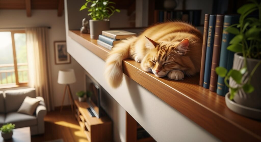 The statement indicates that cats prefer to select their resting places on upper surfaces of furniture and shelves. The height of this position allows you to observe your surroundings while maintaining a safe space which shows that your friend trusts you but needs his personal space.