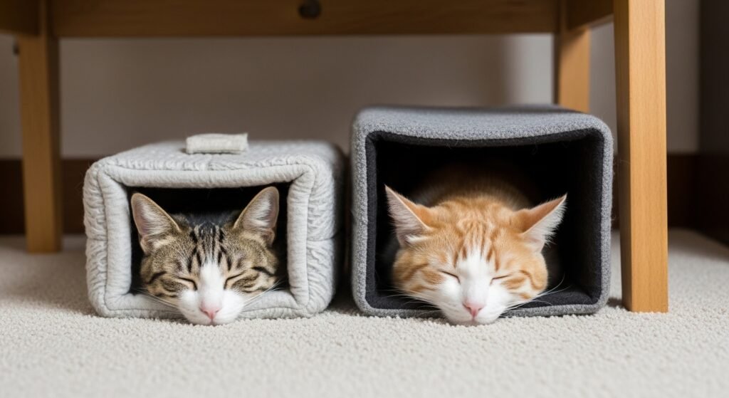 Some pets prefer to sleep in protected hiding areas. The situation lets them experience enclosed comfort while they stay nearby to you.