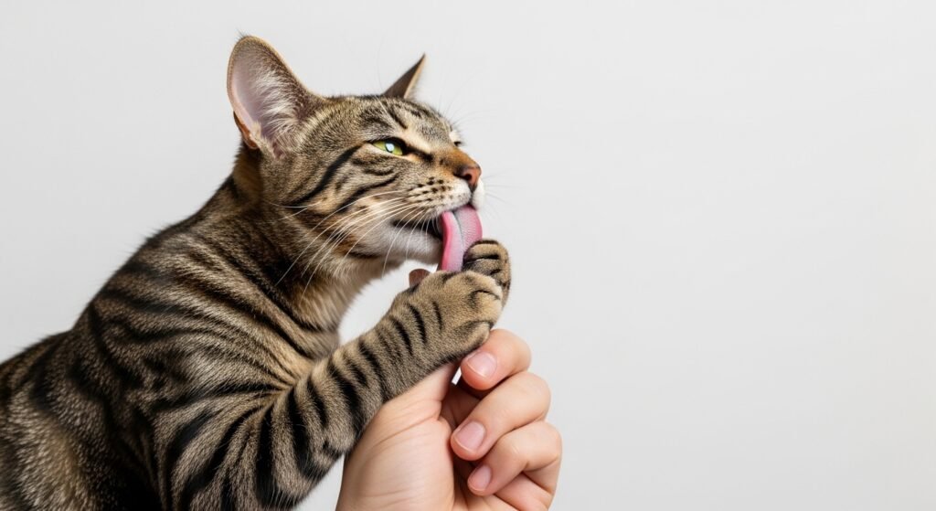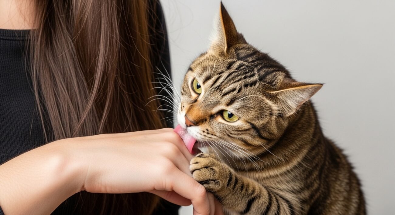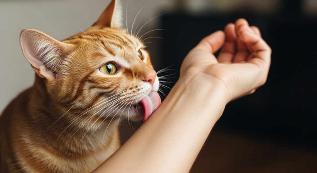 The mouth of a cat contains scent glands which allow it to smell different things. Your cat uses licking to transmit scent signals which establish you as a secure element of their home territory.