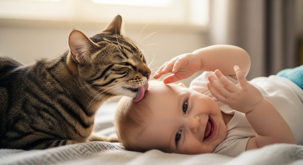 Experts consider licking to function as an attachment display. The behavior occurs with purring and relaxed body movements to create a strong emotional bond.
