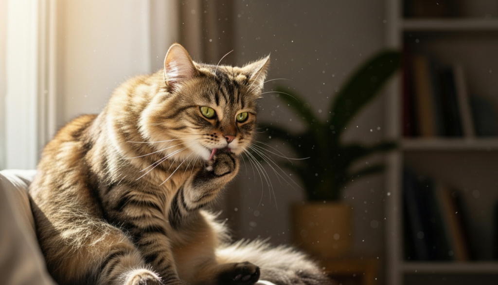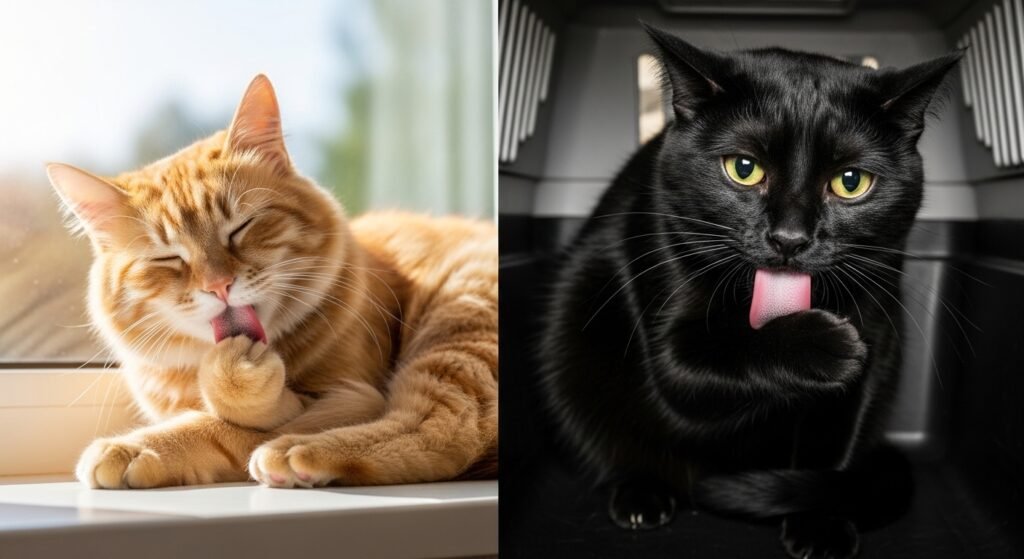 Cats find repetitive licking to be a soothing method for achieving their desired state. The behavior shows contentment for relaxed times, while it shows tension during stressful times.