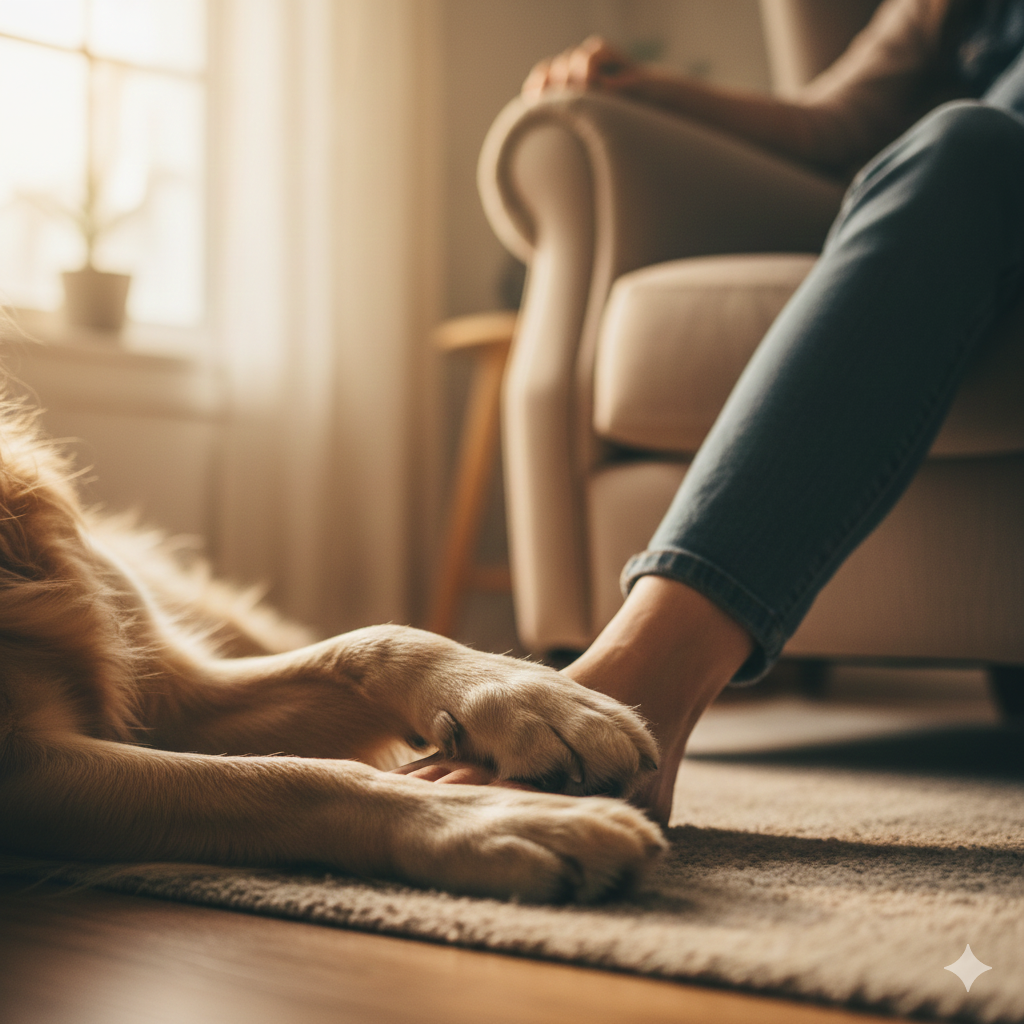 The gesture is just like canine hand-holding a way for your dog to keep in contact with you while they relax. By placing their paw on your foot or lap they feel that connection with you which helps them feel safe and secure.